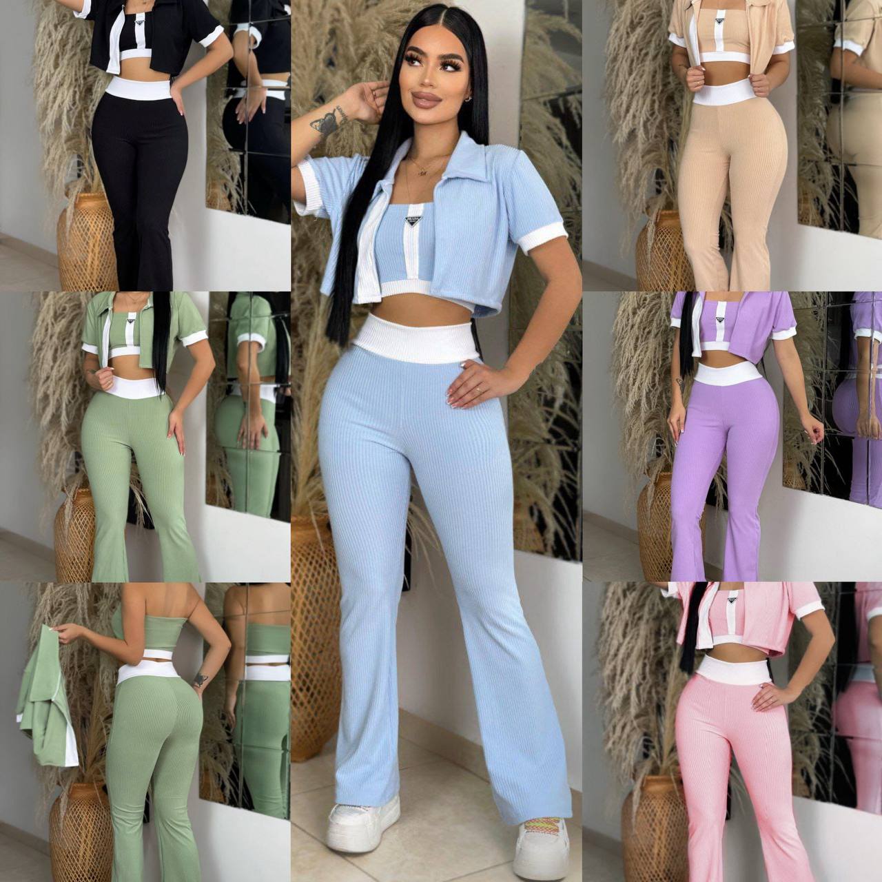 Hermoso conjunto de tres prendas, incluye pantalón, disponible en variados colores, fabricado en tela Rib cool